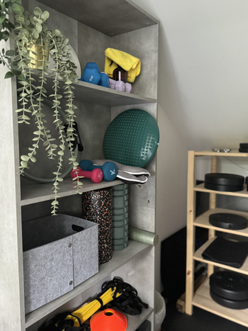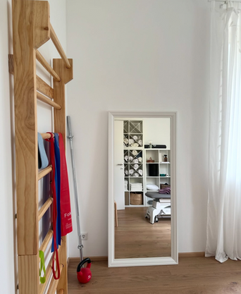 Trainingsraum ausgestattet mit Squatrack, Langhantel mit vielen verschiedenen Gewichten, Kettlebell, Oped Trainingsmatte, Spiegel, Agility & Drills Tools, Faszienrollen, Bällen, Stepper, Widerstandsbändern aller Art uvm.